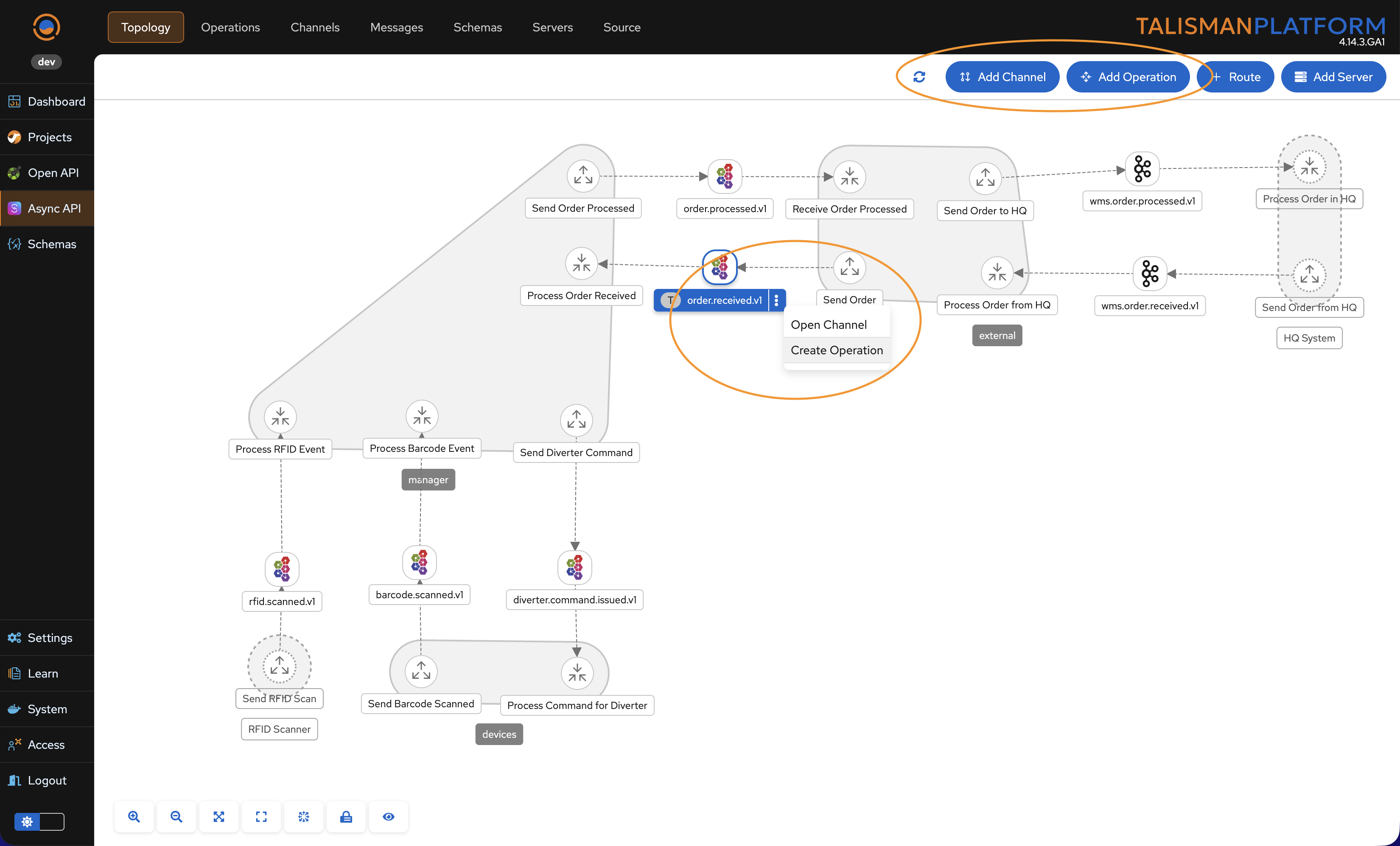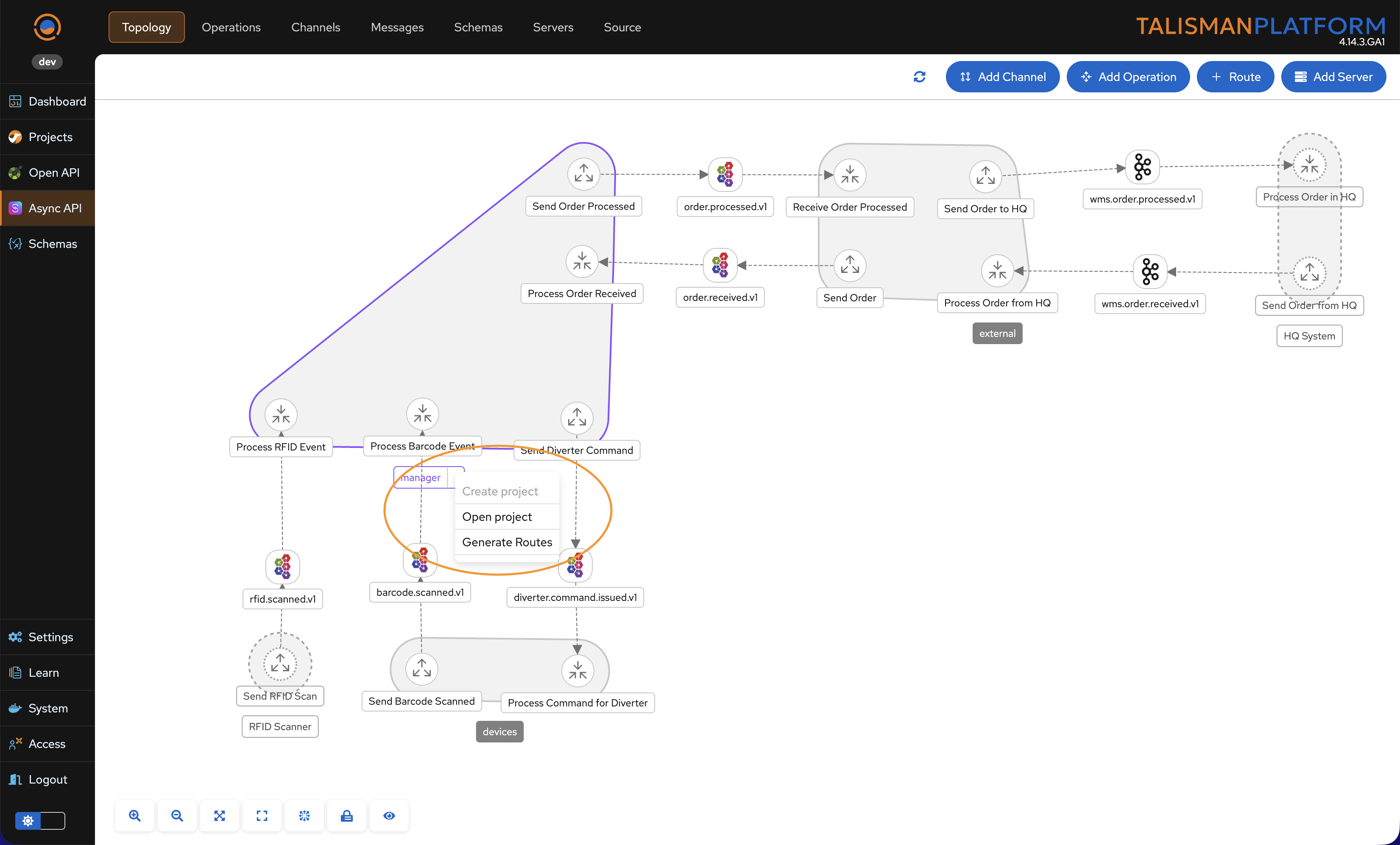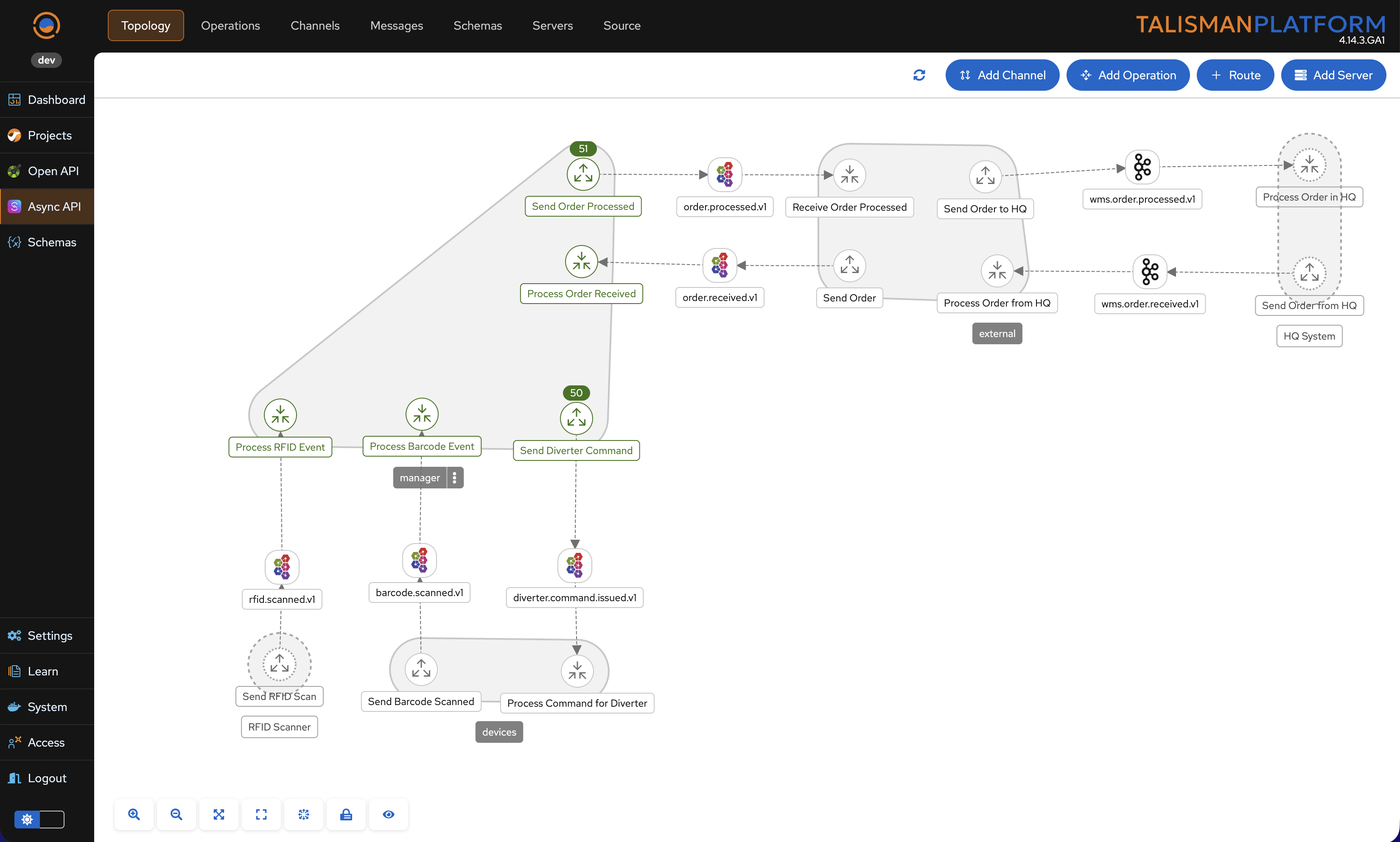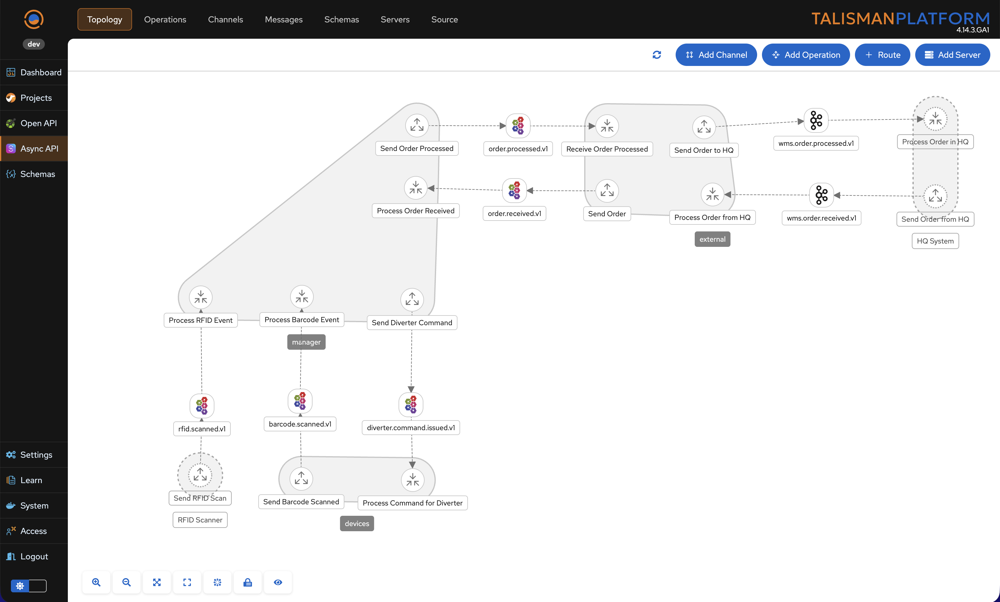 The Talisman AsyncAPI Designer is the central workspace for architecting event-driven systems. It allows developers to model the flow of data between internal microservices and external systems using a visual, topology-first approach.